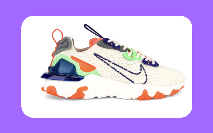 Want kicks with more flair? You got it. Level up your look with the Nike react vision sneaker for a pop of color that’ll elevate any jeans and t-shirt combo. These shoes were made to be seen.