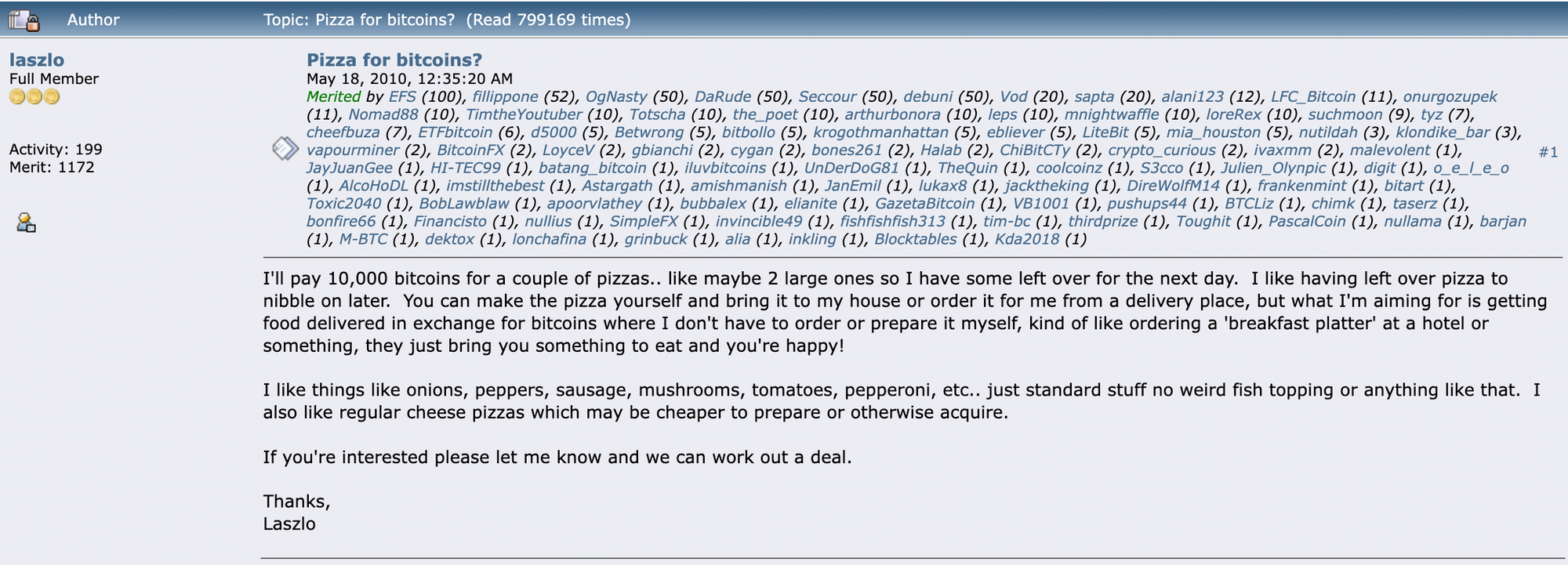 In 2010, Laszlo, an early bitcoin developer, posted his call to buy 2 pizzas for 10,000 bitcoins on Bitcointalk Forum, a popular forum for early bitcoiners. At the time, one bitcoin was worth just a few cents.