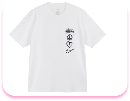 From sneakers to streetwear, find the wearable items you need to capture total coolness. Find pieces that'll have you saying, "thanks, I earned bitcoin on it" like the Nike x Stussy Peace, Love, Swoosh T-shirt.