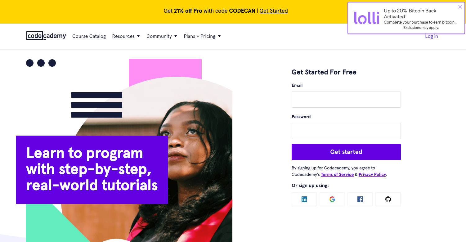 We are thrilled to announce that new Codecademy users can now earn 20% back in free bitcoin when using Lolli, the leading bitcoin rewards company.