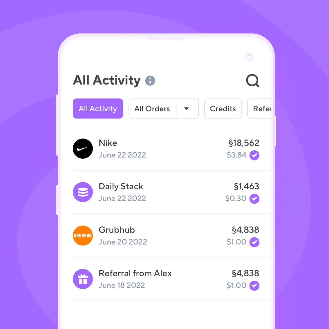 Tap the 'Activity' tab at the bottom of your screen on the Lolli app for a breakdown of all your Lolli rewards and activity! There, you'll see everything from your Daily Stack rewards to all the bitcoin rewards you've earned by shopping with Lolli.