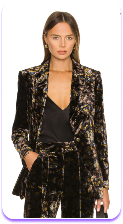 Shop glam finds like this velvet Veronica Beard Long & Lean Dickey Jacket, and mix and match with your own bottoms or snag the matching pants. Pair with a lacy cami, feminine blouse. or bra top for an edgy spin on your classic NYE look.