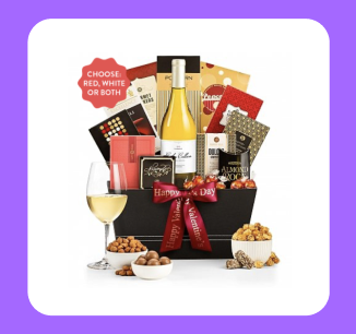 Feel like royalty with this gift basket of wine, sweets, and snacks.