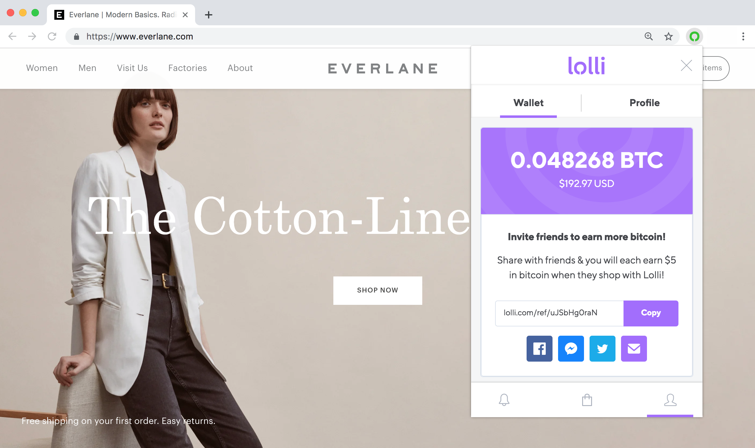 We realized the solution was actually quite simple: distribute bitcoin through online shopping, an activity that millions of people do every day. All you have to do is download Lolli and shop as you normally would. Our brand partners pay us to drive sales to their sites. When you shop on one of our partners’ sites — like Jet, Bloomingdale’s, Hotwire, or SeatGeek — we get commission for driving the sale. We then split that commission with you, sending bitcoin to your Lolli wallet. Everyone wins.