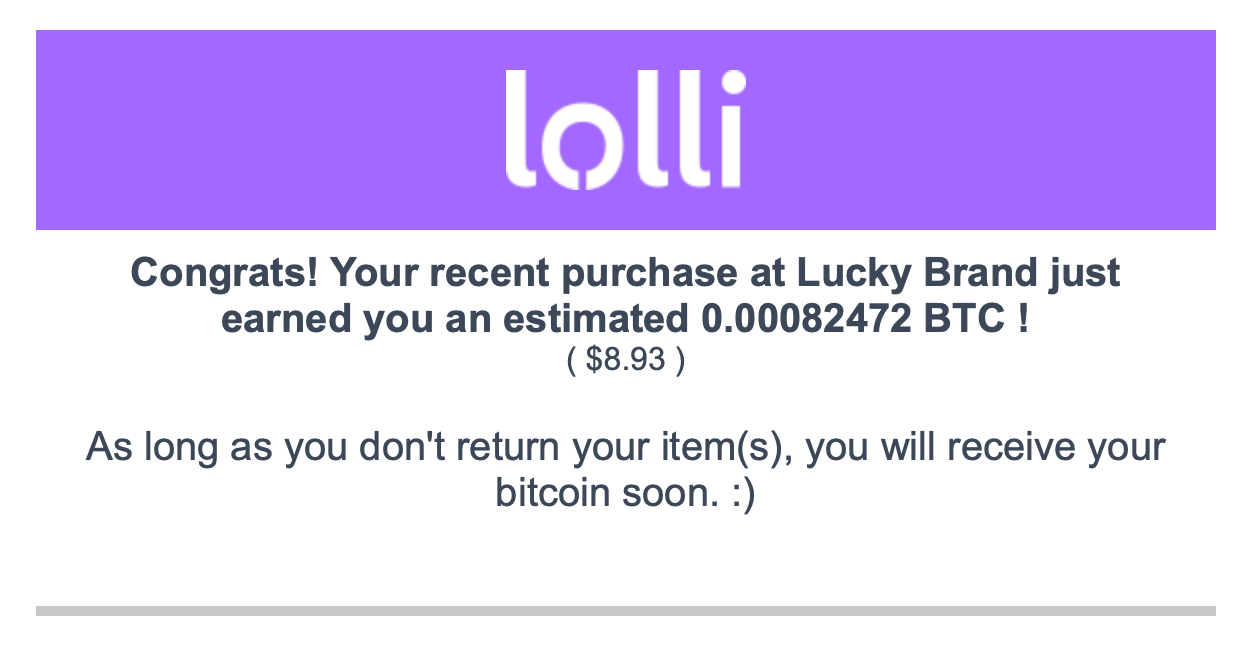 When we first receive notification of your order amount, we issue an "estimated reward" based on the market value of bitcoin at the time you made your purchase. This is the event behind those uplifting "You Just Earned Bitcoin With Lolli 🍭" emails you so love to get! Here's an example of a reward I recently received myself: I bought some shirts and shorts from Lucky Brand the morning of June 24th, 2019, and Lucky, being the awesome partner they are, sent my estimated reward over within 2 minutes! I received 82,472 sats, which was the equivalent of $8.93 based on the market rate of bitcoin at the time, which was $10,827.92. (Note to future readers: I realize this will seem like a teeny tiny amount when you're sitting on 6-figure+ exchange rates.)