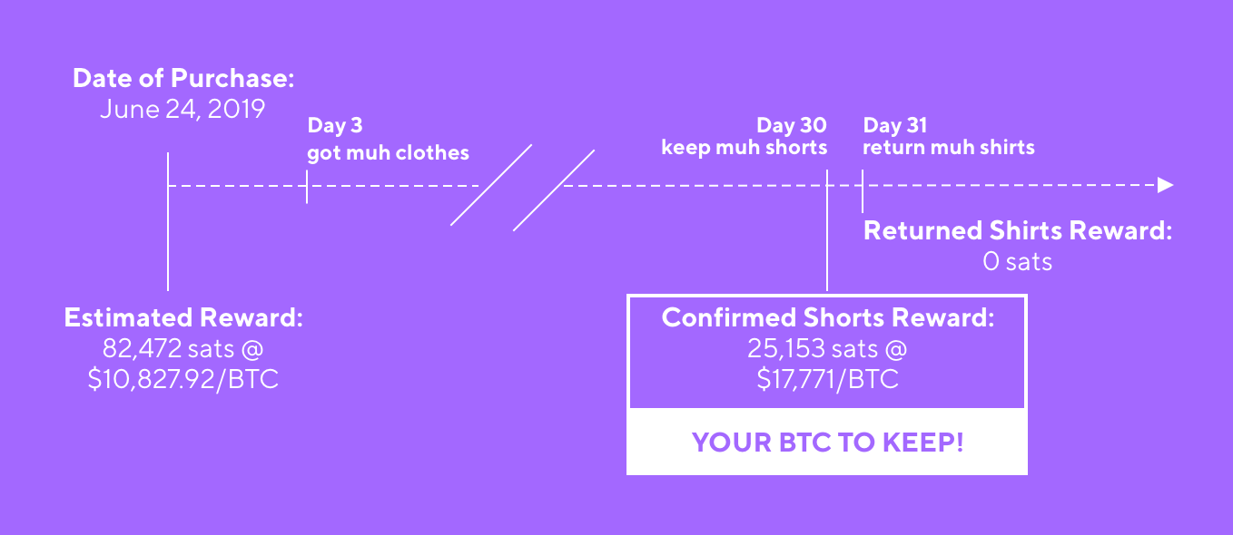 So let's say I receive my shorts and shirts, and I totally dig the shorts, but the shirts just didn't make me look sexy enough. I keep the shorts, and after 30 days pass, Lolli knows I can no longer return them and "locks in" my bitcoin reward, converting it from an "estimated reward" to a "confirmed reward." I'm gonna go out on a limb and guess that 30 days from my Lucky purchase bitcoin will be at $17,771 (not financial advice!). In addition, Lucky receives my returned not-making-me-as-sexy-as-I-would-have-liked shirts on Day 31 and alerts Lolli, so Lolli reverts the part of my purchase (let's say half of it for easy math), reducing my fiat reward amount to $4.47. Lolli then recalculates my final bitcoin reward at 25,153 sats, but this is less than the 82,472 sats estimated in my original reward email! Yes, yes it is. Let's explore why.