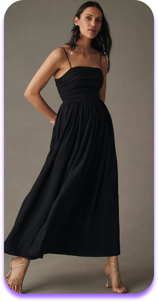Head to Anthropologie to find classic looks made new, with cool detailing like this black maxi dress with a twist, The Lorelei Ruched-Bodice Midi Dress.