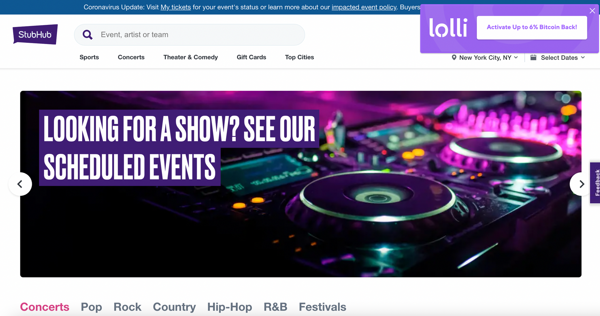 New York, NY — August 25, 2021 — Lolli, the leading bitcoin rewards company, has today announced a partnership with StubHub, the world’s most trusted ticket marketplace. This partnership will give users the ability to earn up to 6% bitcoin back on tickets for sporting events, theatre, concerts, and more.