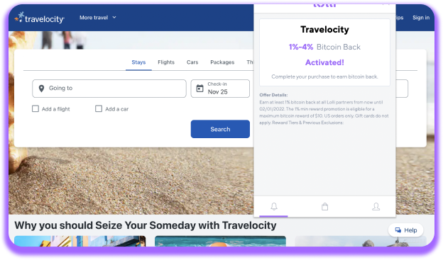 We're thrilled to announce that Travelocity is now on Lolli! Earn up to 4% bitcoin at Travelocity leading online booking website for rewards on your next getaway.