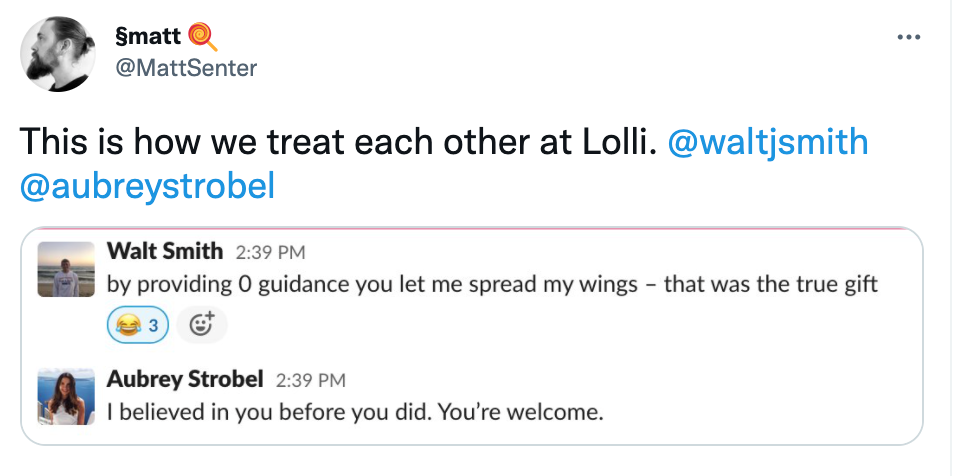 Thank you to the Lolli community for your support, subscribing and following our channels, spreading the good news about our company through referral links, and for all the lovely tweets. I do read most of them! And thank you to Alex, Matt, and the entire Lolli team. I love getting to work with you all every day. Proud of all the work we've done and know we're just getting started.
